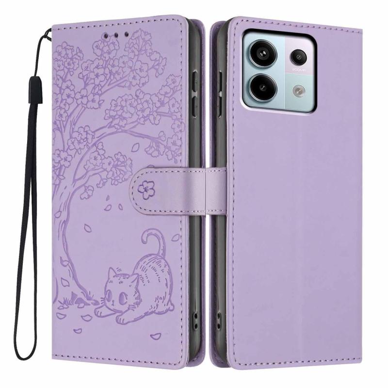 For Redmi Note 13 Pro 5G Tree Cat Embossed Flip Vegan Leather Phone Case(Purple)
