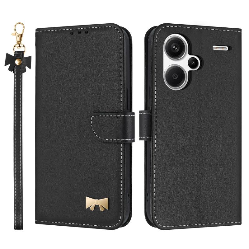 For Redmi Note 13 Pro+ Metal Bow Leather Phone Case with Hand Strap(Black)