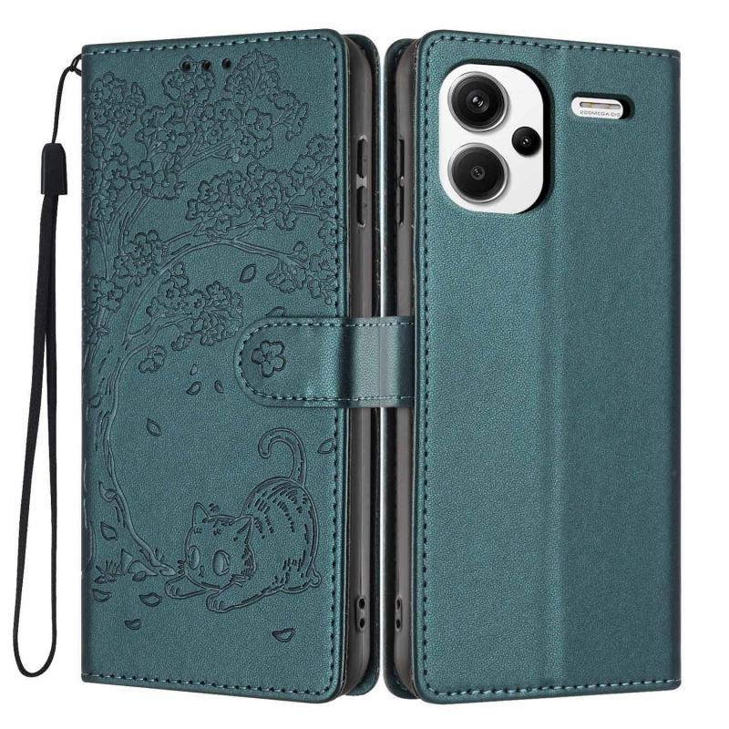 For Redmi Note 13 Pro+ Tree Cat Embossed Flip Vegan Leather Phone Case(Deep Green)