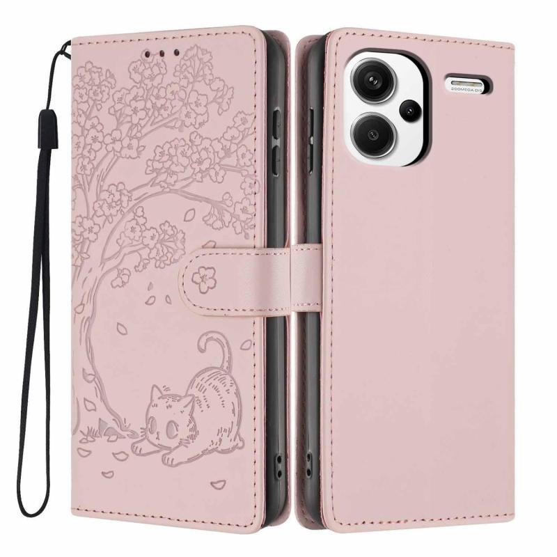 For Redmi Note 13 Pro+ Tree Cat Embossed Flip Vegan Leather Phone Case(Rose Gold)