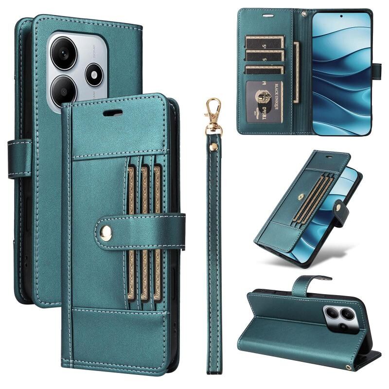 For Redmi Note 14 4G 163.25mm Six Card Slots Buckle Leather Phone Case with Lanyard(Green)