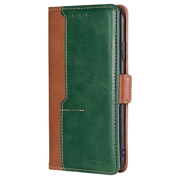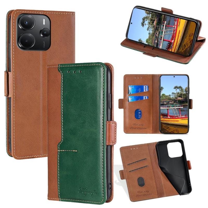 For Redmi Note 14 4G 164.84mm Contrast Color Side Buckle Leather Phone Case(Light Brown + Green)
