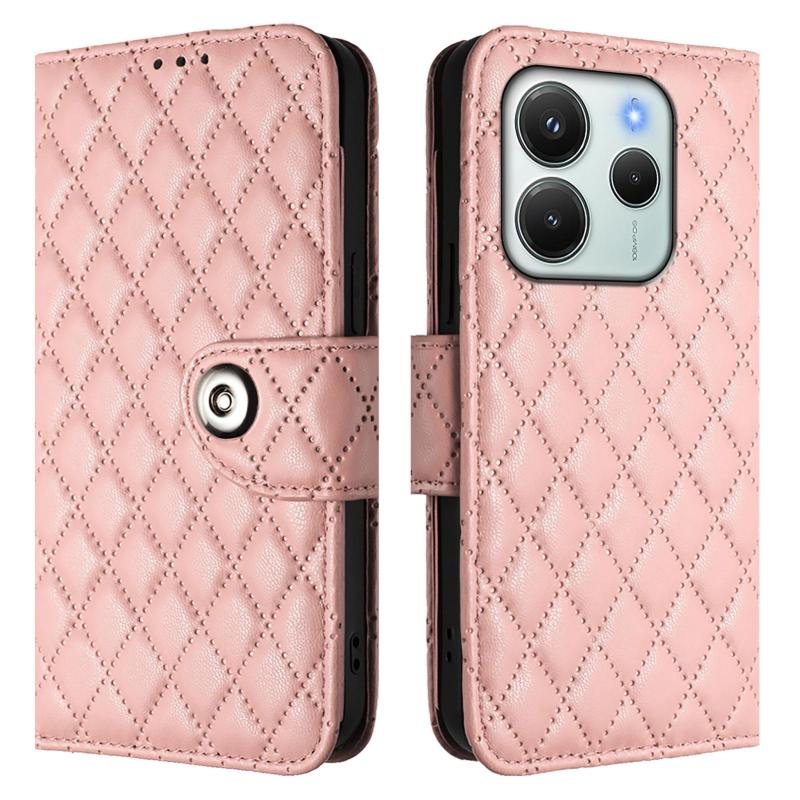 For Redmi Note 14 4G 164.84mm Rhombic Texture Flip Leather Phone Case with Lanyard(Coral Pink)