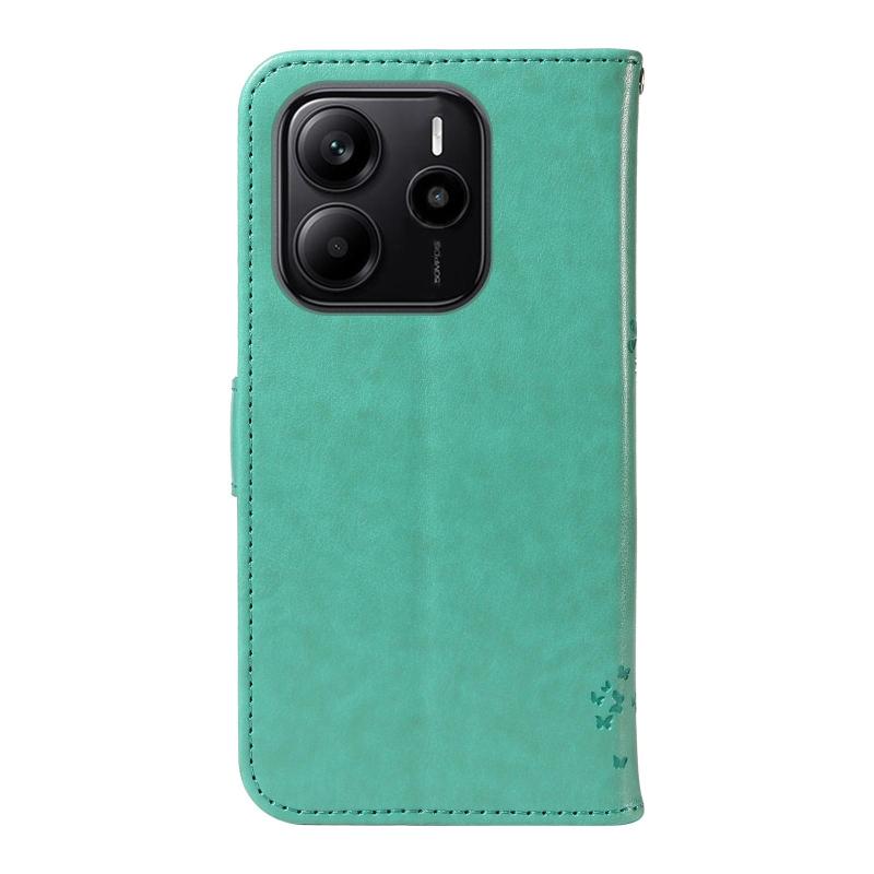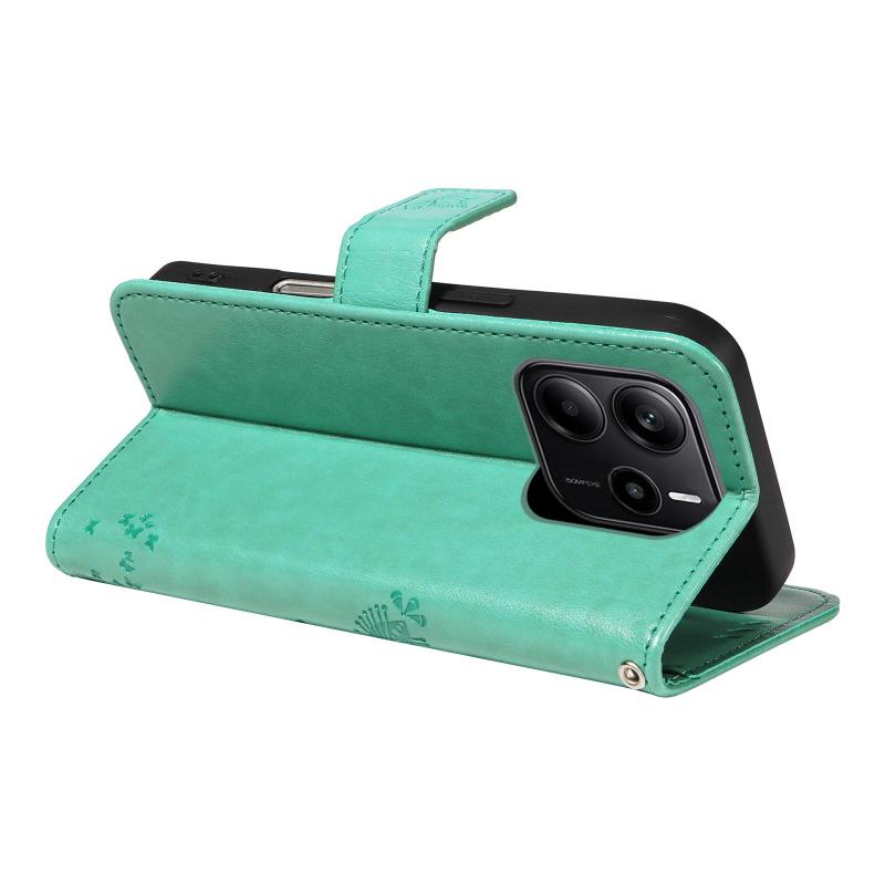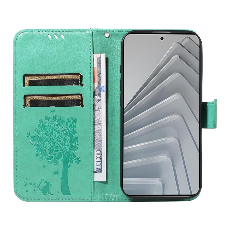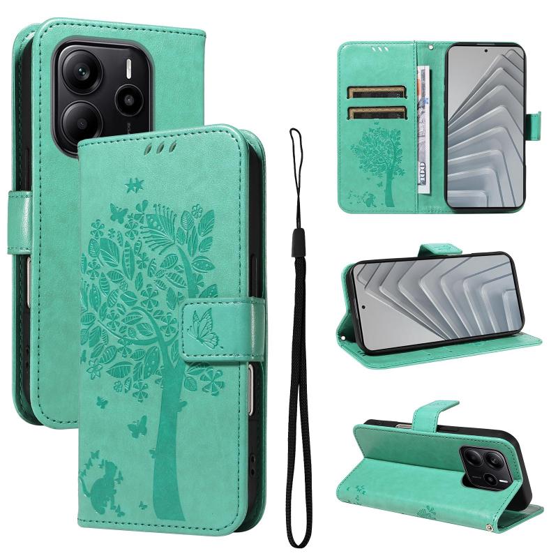 For Redmi Note 14 4G Global 163.25mm Tree & Cat Embossed Pattern Flip Leather Phone Case(Green)