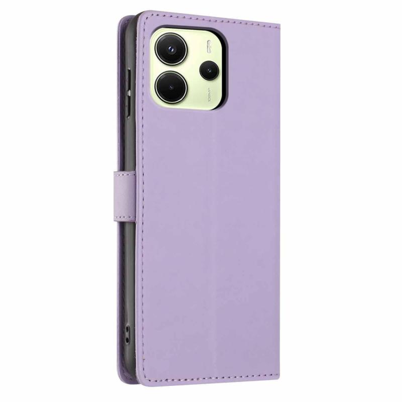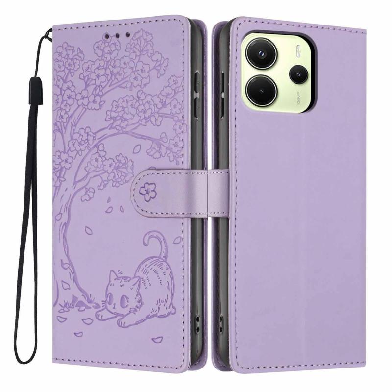 For Redmi Note 14 4G Global 163.25mm Tree Cat Embossed Flip Vegan Leather Phone Case(Purple)