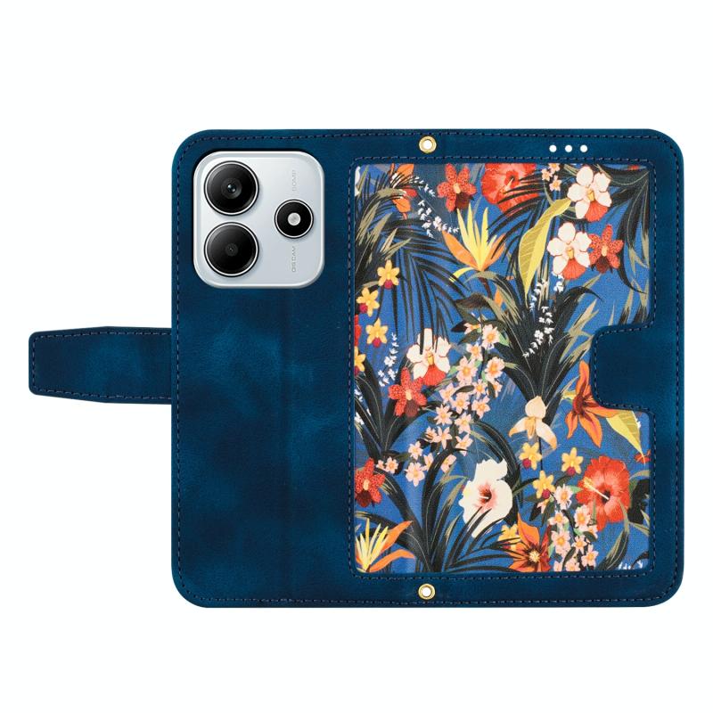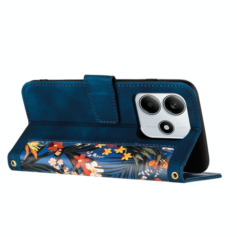 For Redmi Note 14 5G Floral Pattern Leather Phone Case with Lanyard(Dark Blue)