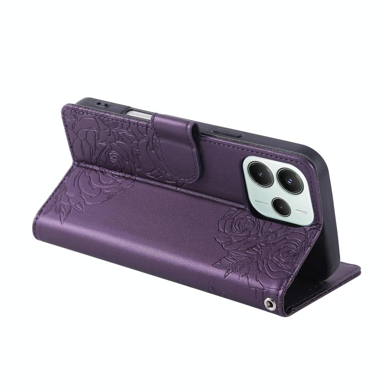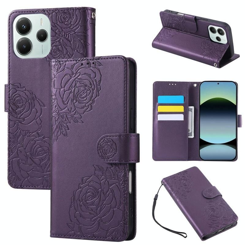 For Redmi Note 14 5G Global Rose Flower Embossed 3-Card Slots Leather Phone Case(Deep Purple)