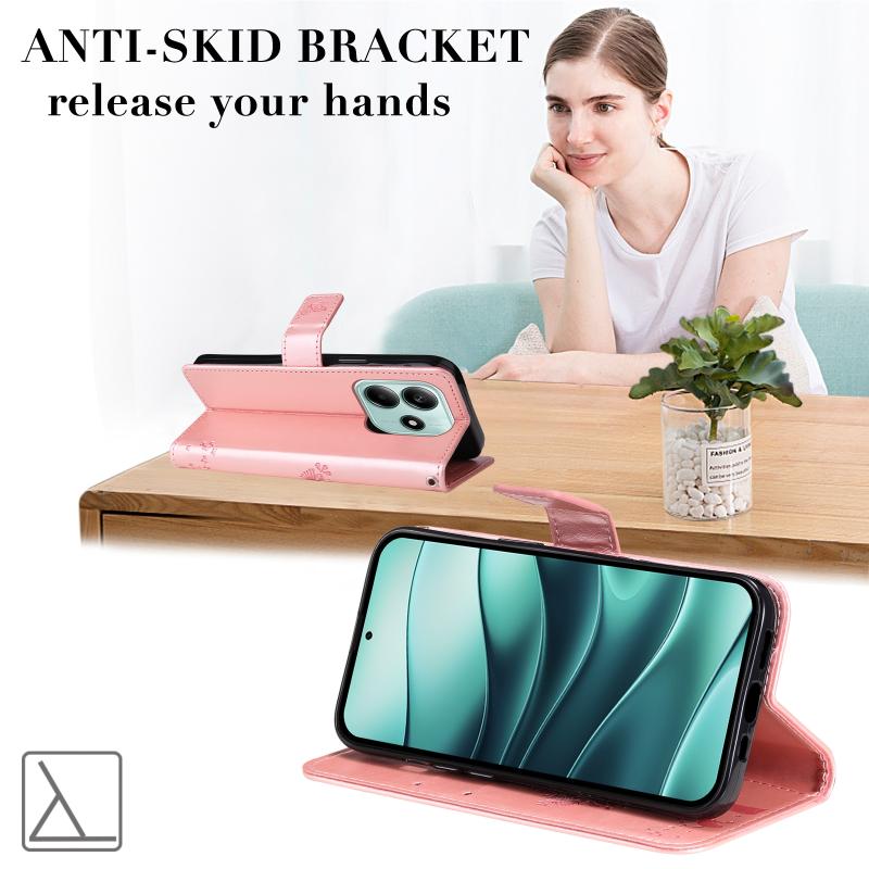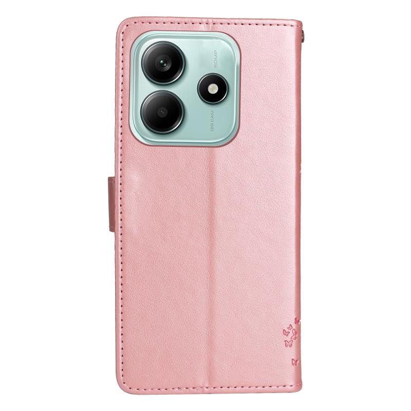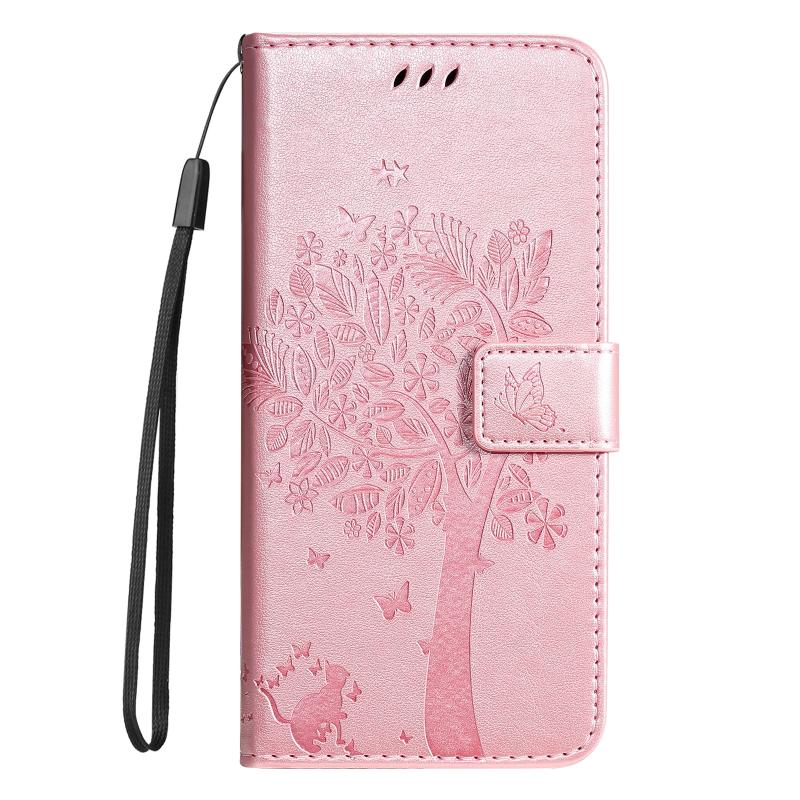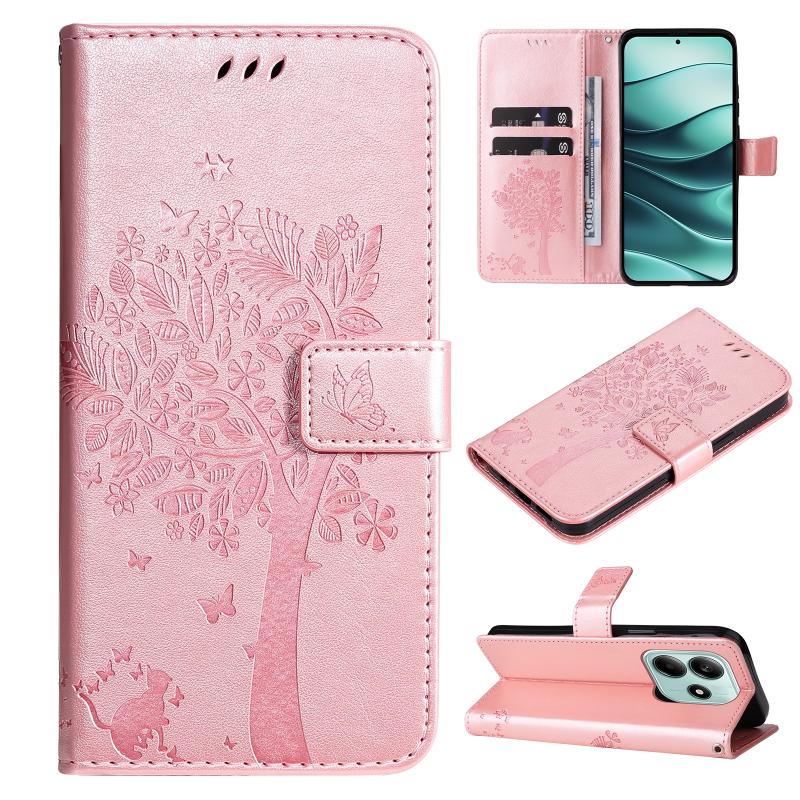 For Redmi Note 14 5G Tree & Cat Embossed Pattern Flip Leather Phone Case(Rose Gold)