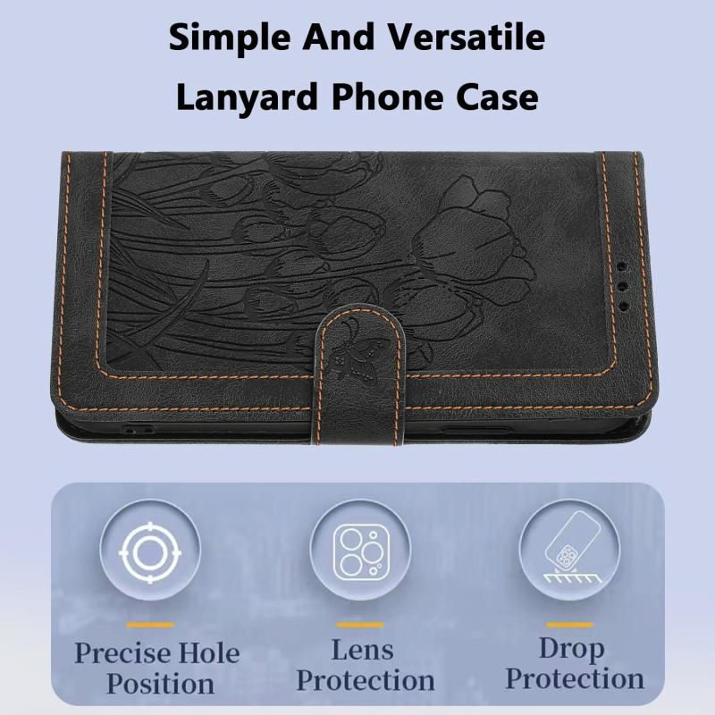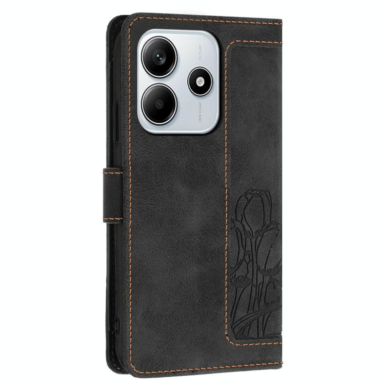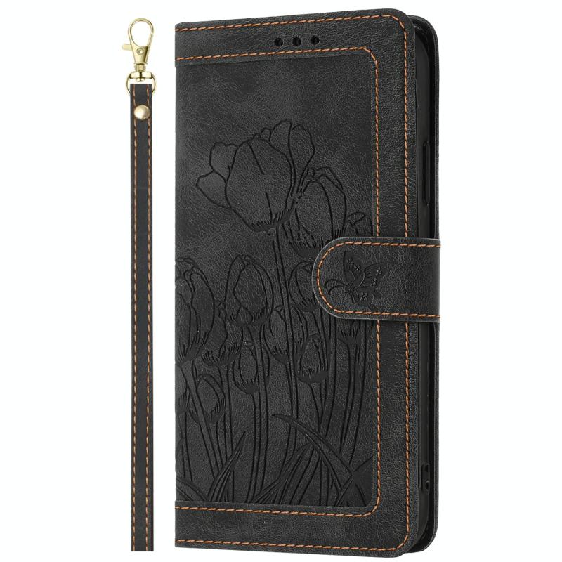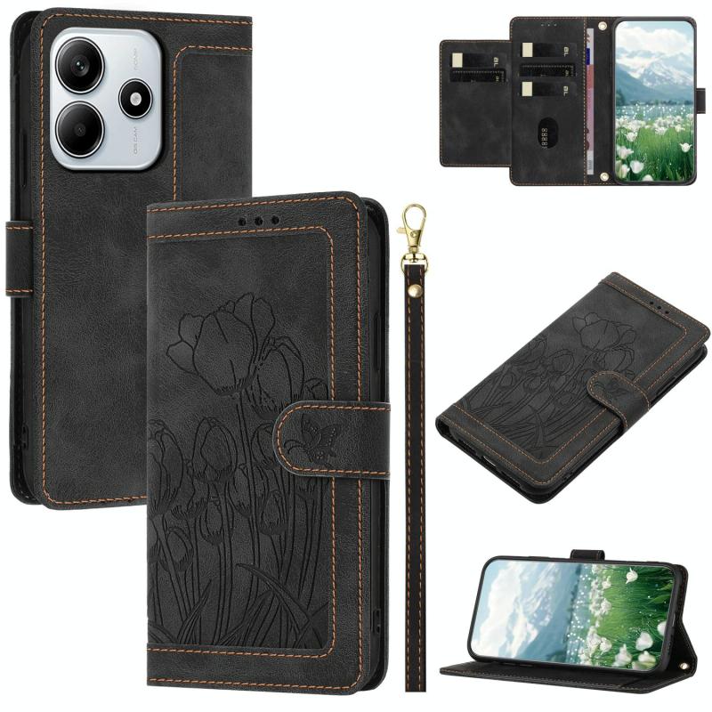 For Redmi Note 14 5G Tulips Embossed Leather Phone Case with Lanyard(Black)