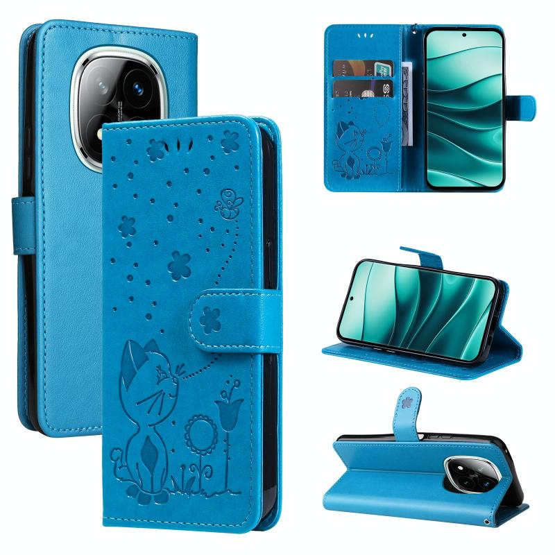 For Redmi Note 14 Pro / 14 Pro+ 5G Cat and Bee Embossed Flip Leather Phone Case(Blue)