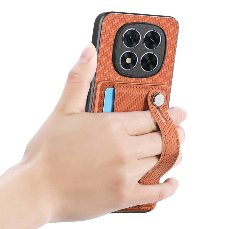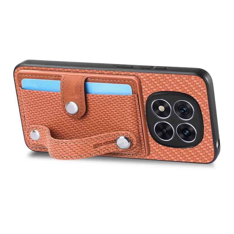 For Redmi Note 14 Pro 5G Wristband Kickstand Card Wallet Back Phone Case with Tool Knife(Brown)