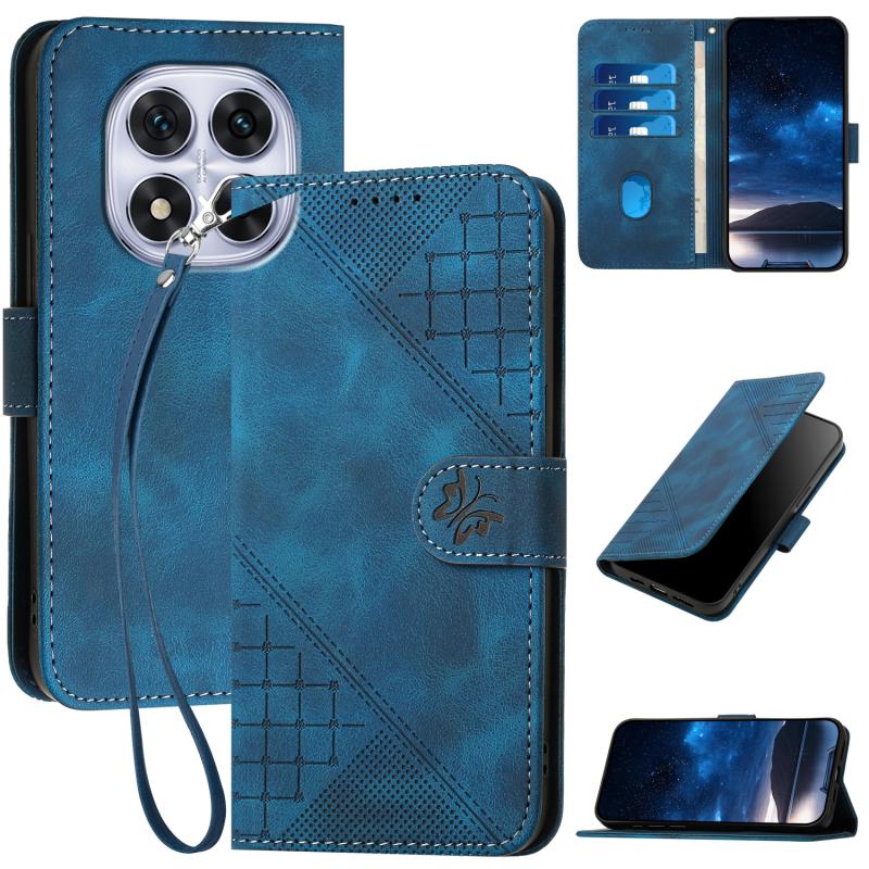 For Redmi Note 14 Pro 5G YX0080 Grid Butterfly Embossed Pattern Leather Phone Case with Lanyard(Dark Blue)