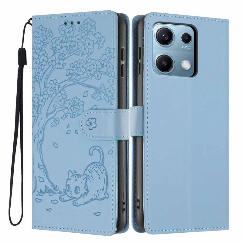 For Redmi Note 14S 4G Tree Cat Embossed Flip Vegan Leather Phone Case(Sky Blue)