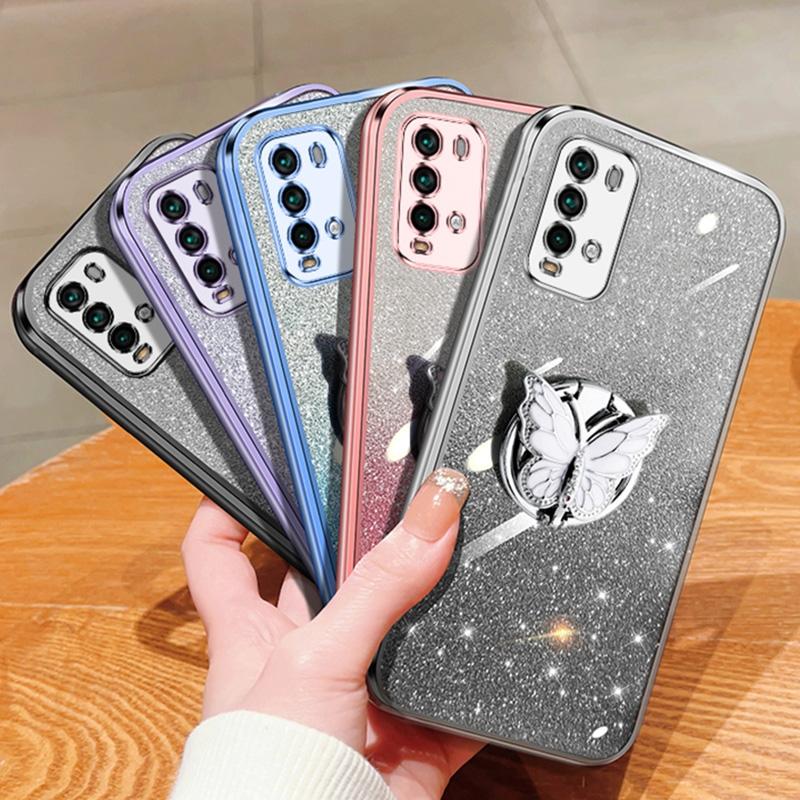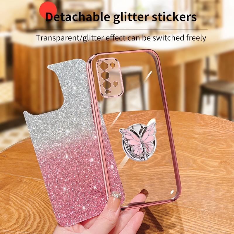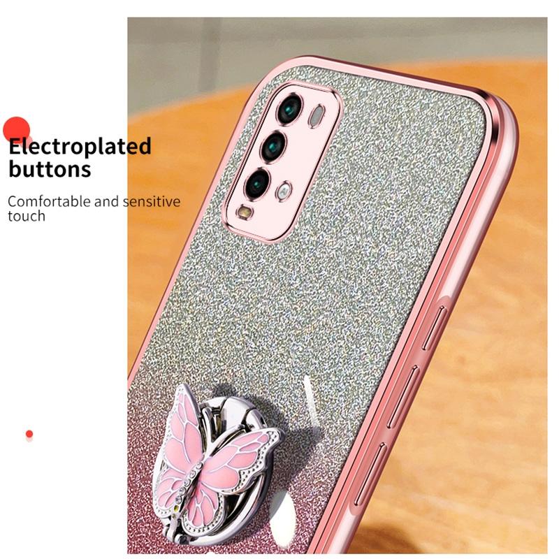 For Redmi Note 9 4G Plated Gradient Glitter Butterfly Holder TPU Phone Case(Purple)