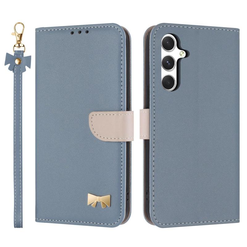 For Samsung Galaxy A14 4G / 5G Metal Bow Leather Phone Case with Hand Strap(Light Blue)