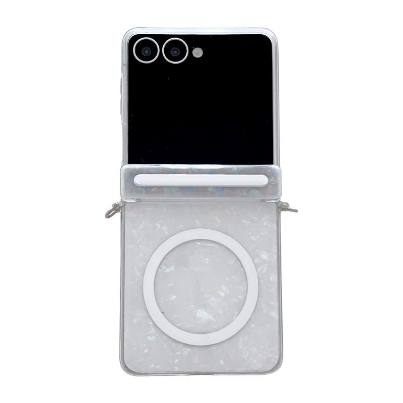 For Samsung Galaxy Flip7 5G Side Buckle Axis Pearlescent Shell Texture MagSafe Phone Case(Beige)