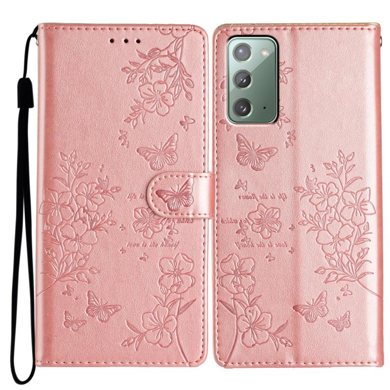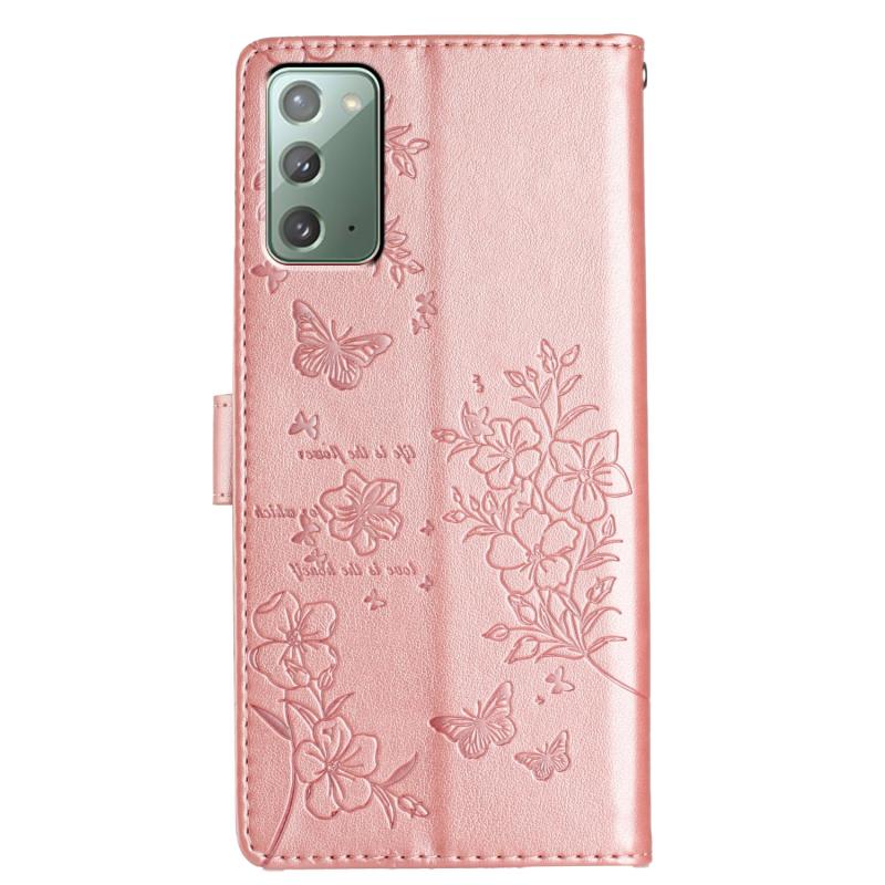 For Samsung Galaxy Note20 Butterflies and Flowers Leather Phone Case(Rose Gold)