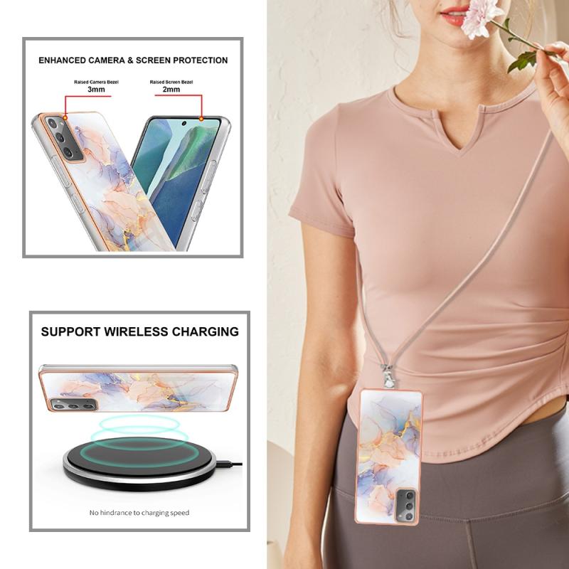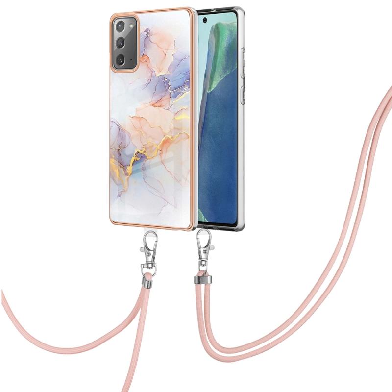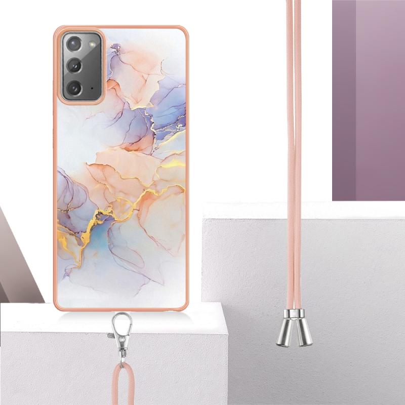 For Samsung Galaxy Note20 Electroplating IMD TPU Phone Case with Lanyard(White Marble)