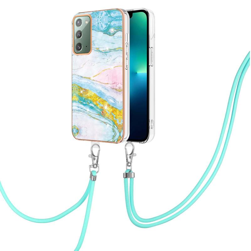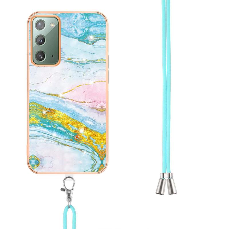For Samsung Galaxy Note20 Electroplating Marble IMD TPU Phone Case with Lanyard(Green 004)