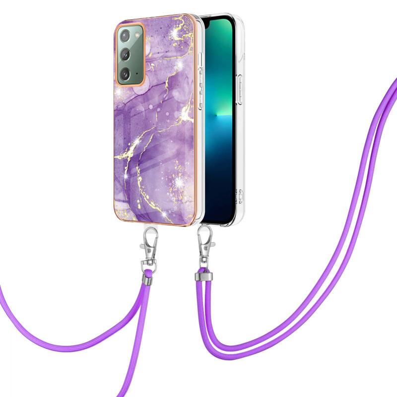For Samsung Galaxy Note20 Electroplating Marble IMD TPU Phone Case with Lanyard(Purple 002)