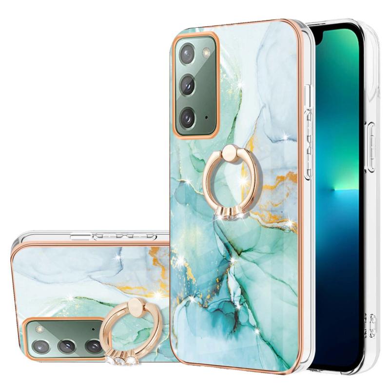 For Samsung Galaxy Note20 Electroplating Marble IMD TPU Phone Case with Ring Holder(Green 003)