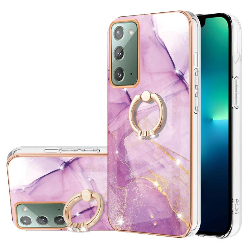For Samsung Galaxy Note20 Electroplating Marble IMD TPU Phone Case with Ring Holder(Purple 001)