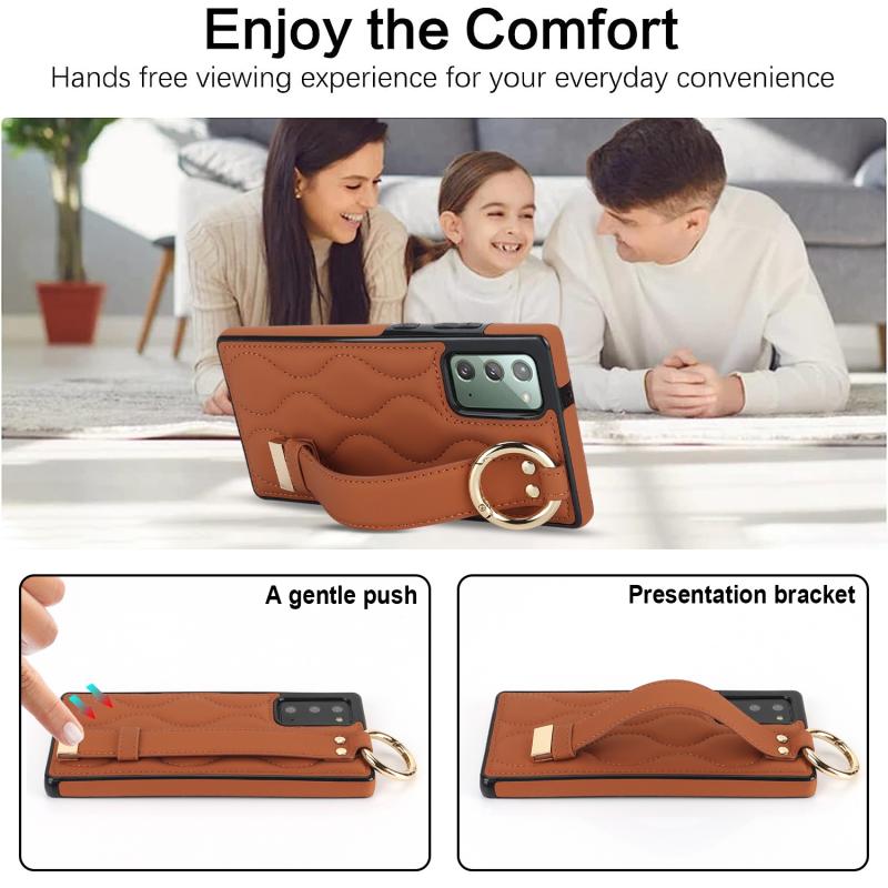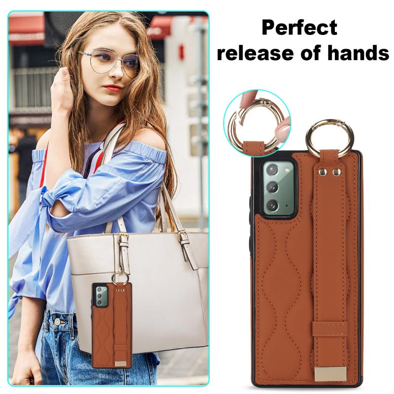 For Samsung Galaxy Note20 Non-slip Full Coverage Ring PU Phone Case with Wristband(Brown)