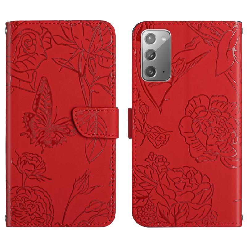 For Samsung Galaxy Note20 Skin Feel Butterfly Peony Embossed Leather Phone Case(Red)