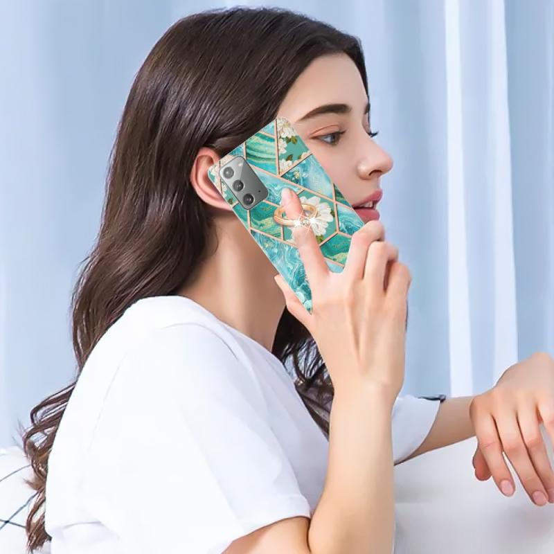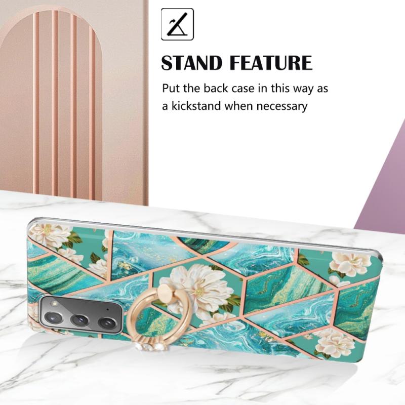 For Samsung Galaxy Note20 Splicing Marble Flower Pattern TPU Ring Holder Case(Blue Flower)