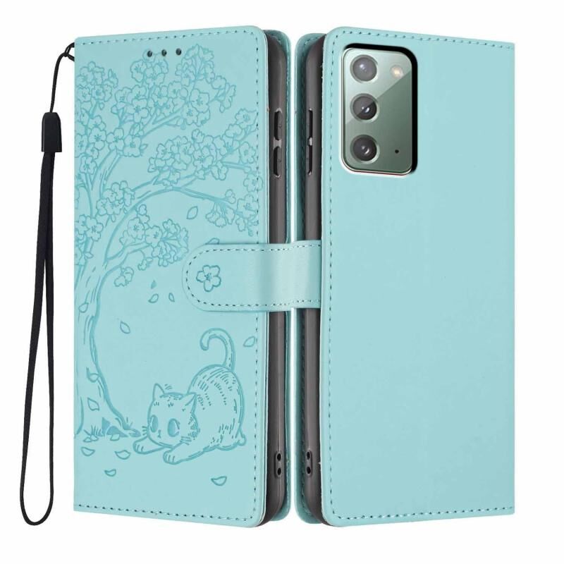 For Samsung Galaxy Note20 Tree Cat Embossed Flip Vegan Leather Phone Case(Light Green)