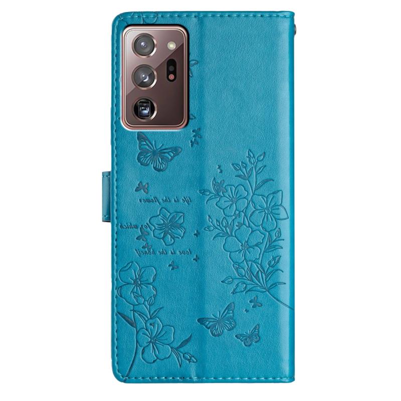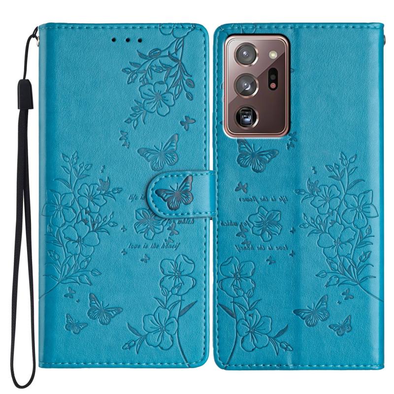 For Samsung Galaxy Note20 Ultra Butterflies and Flowers Leather Phone Case(Blue)
