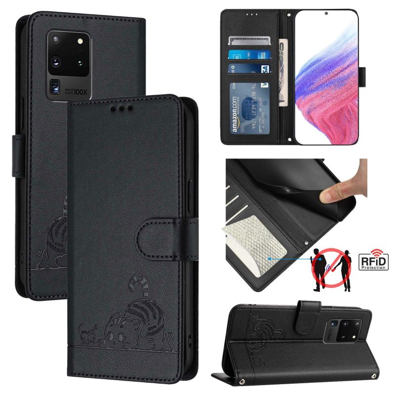 For Samsung Galaxy Note20 Ultra Cat Rat Embossed Pattern RFID Leather Phone Case with Lanyard(Black)
