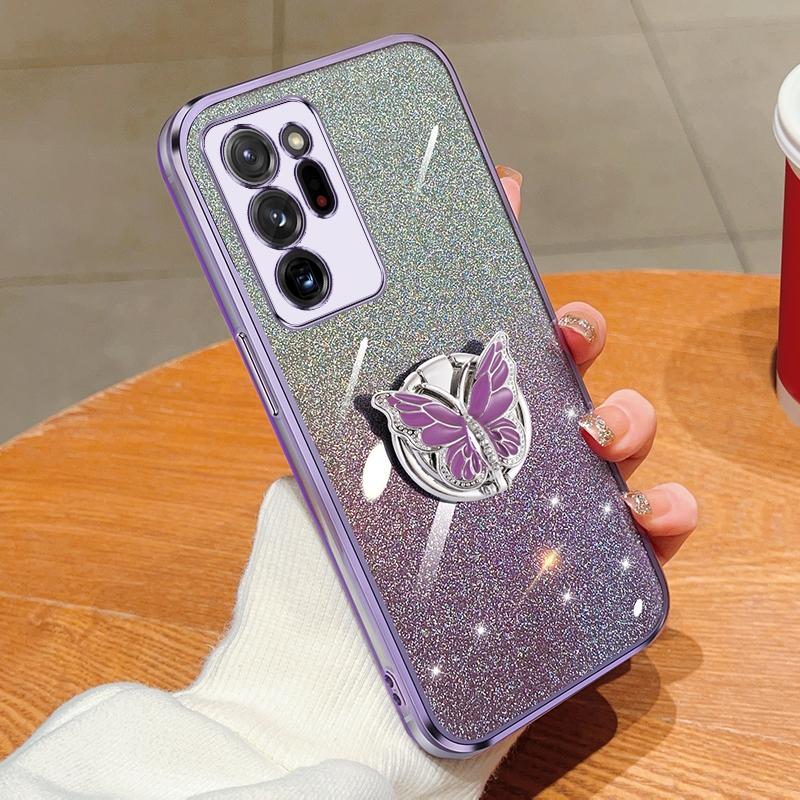 For Samsung Galaxy Note20 Ultra Plated Gradient Glitter Butterfly Holder TPU Phone Case(Purple)