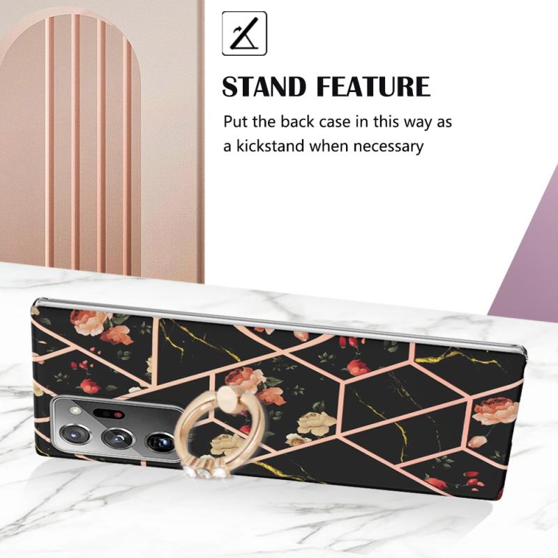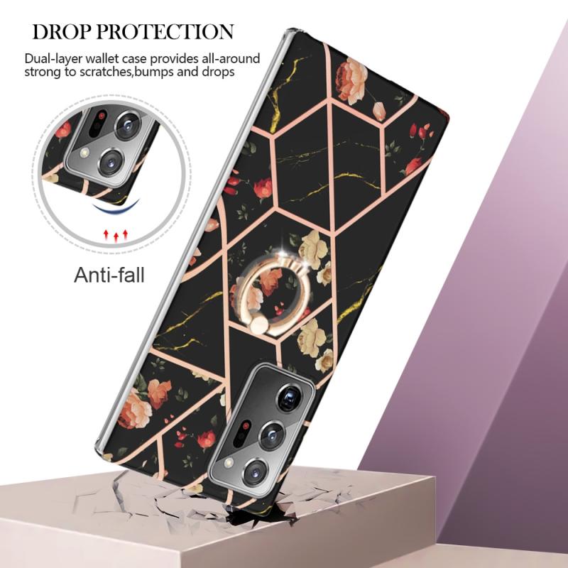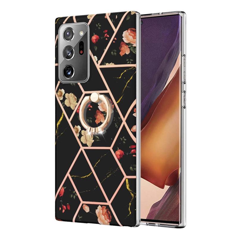 For Samsung Galaxy Note20 Ultra Splicing Marble Flower Pattern TPU Ring Holder Case(Black Flower)