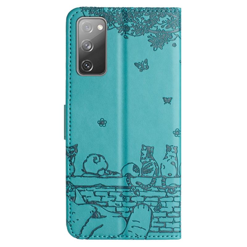 For Samsung Galaxy S20 FE Cat Embossing Pattern Leather Phone Case with Lanyard(Blue)
