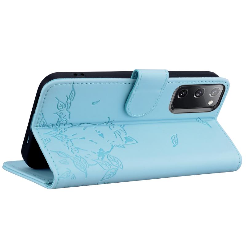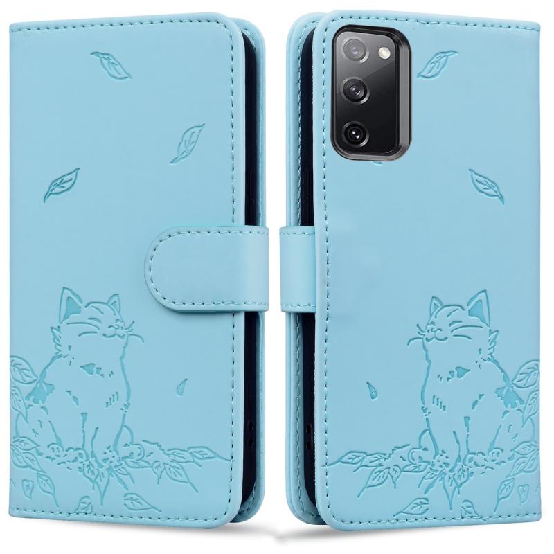 For Samsung Galaxy S20 FE Cute Cat Embossed Leather Phone Case(Sky Blue)