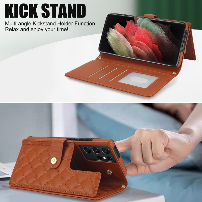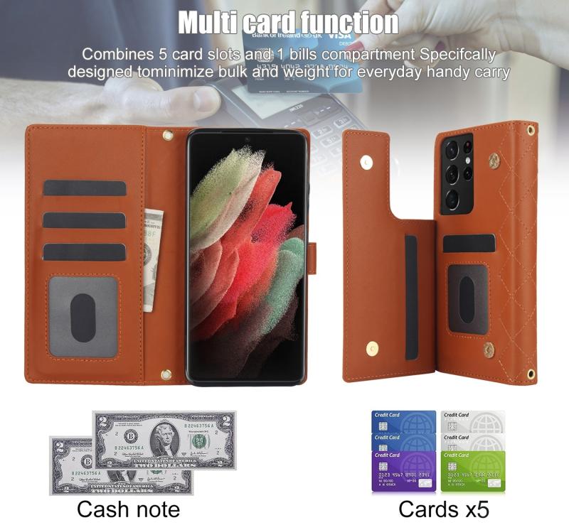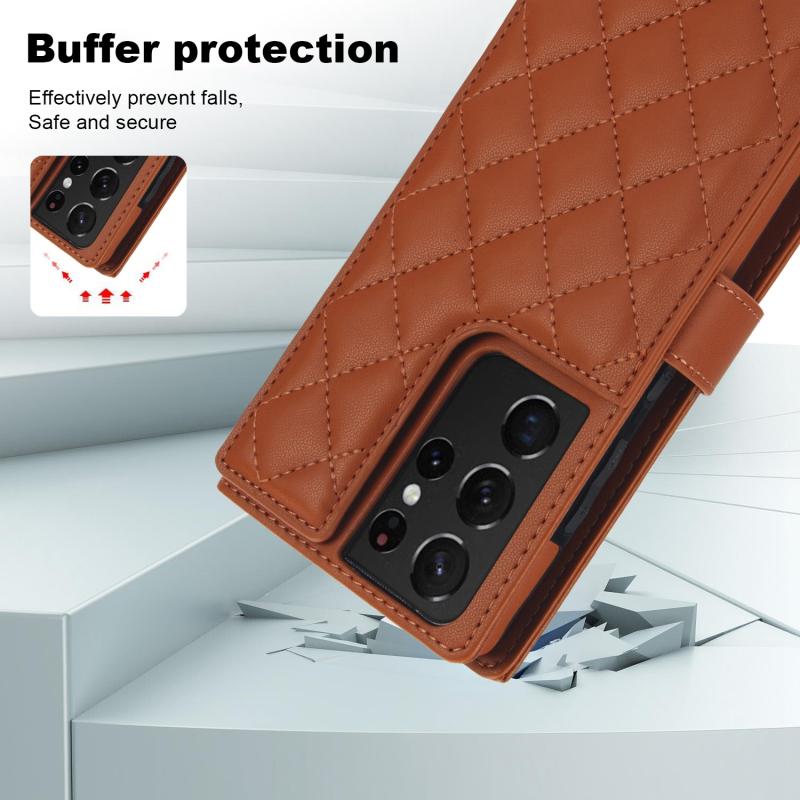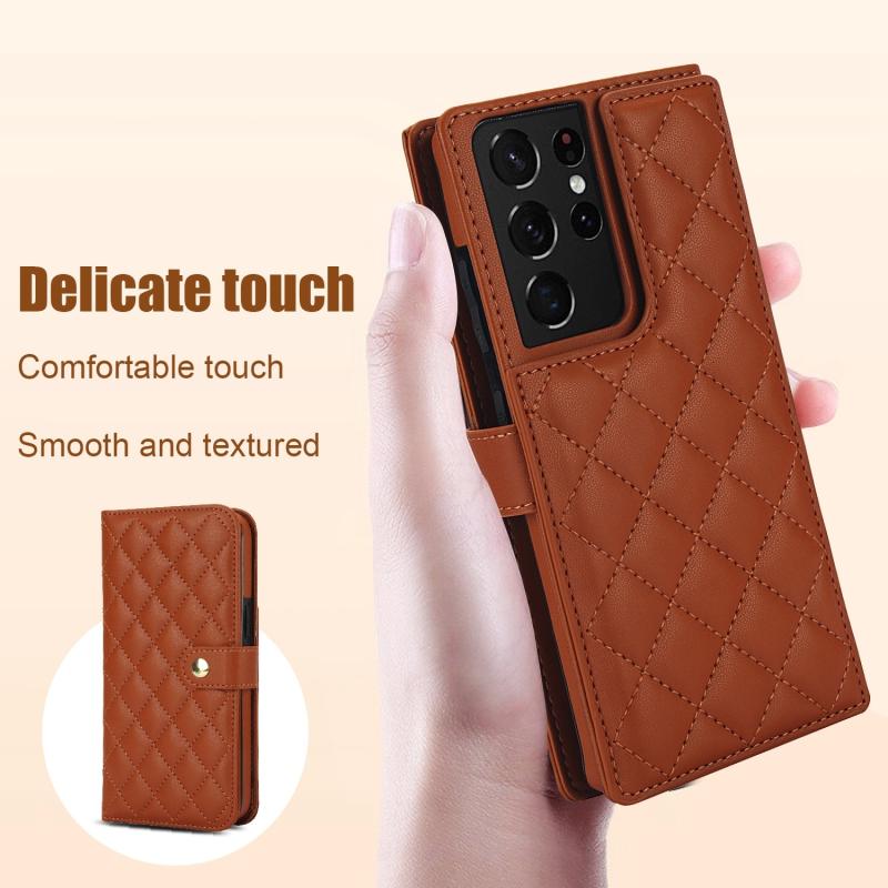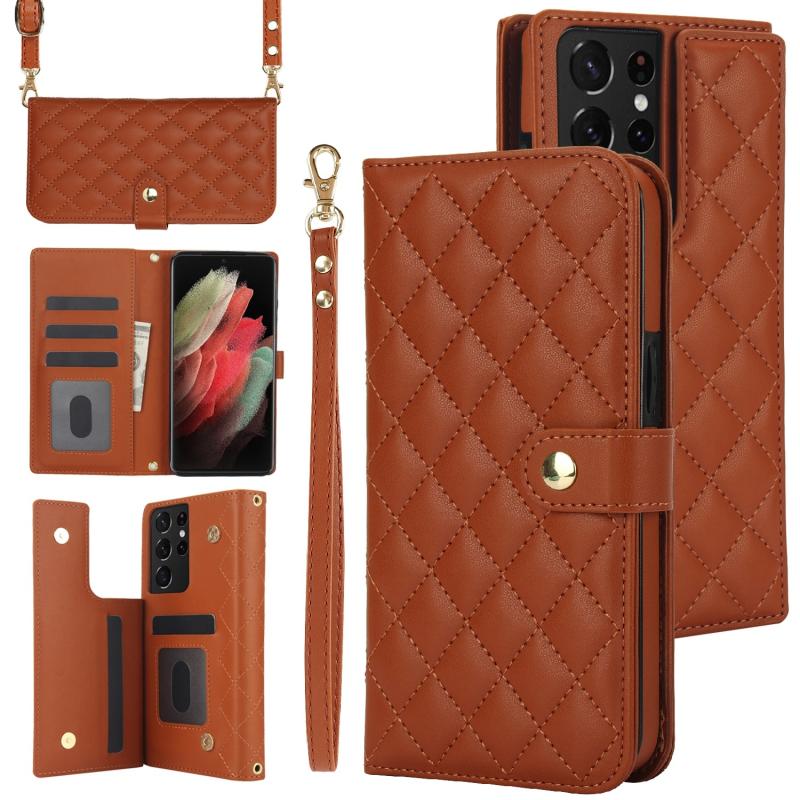 For Samsung Galaxy S21 Ultra 5G Crossbody Multifunction Rhombic Leather Phone Case(Brown)
