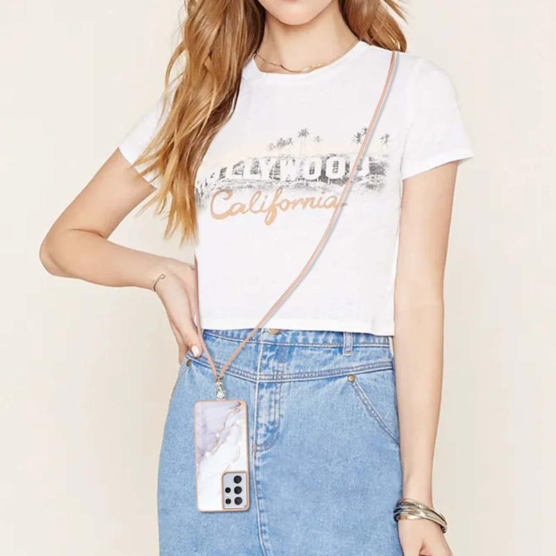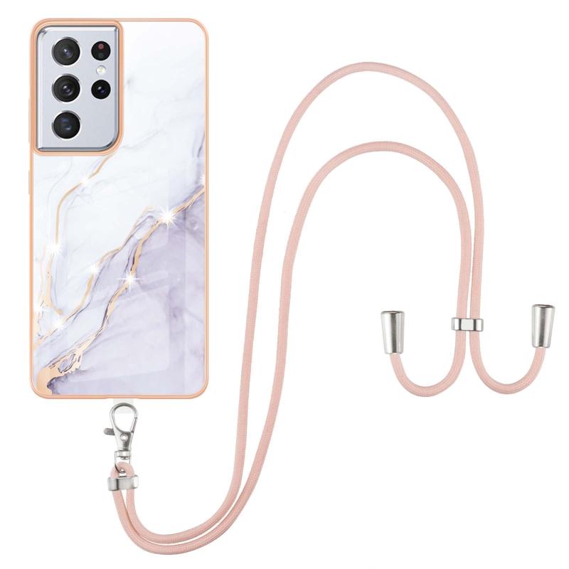 For Samsung Galaxy S21 Ultra 5G Electroplating Marble Pattern IMD TPU Shockproof Case with Neck Lanyard(White 006)