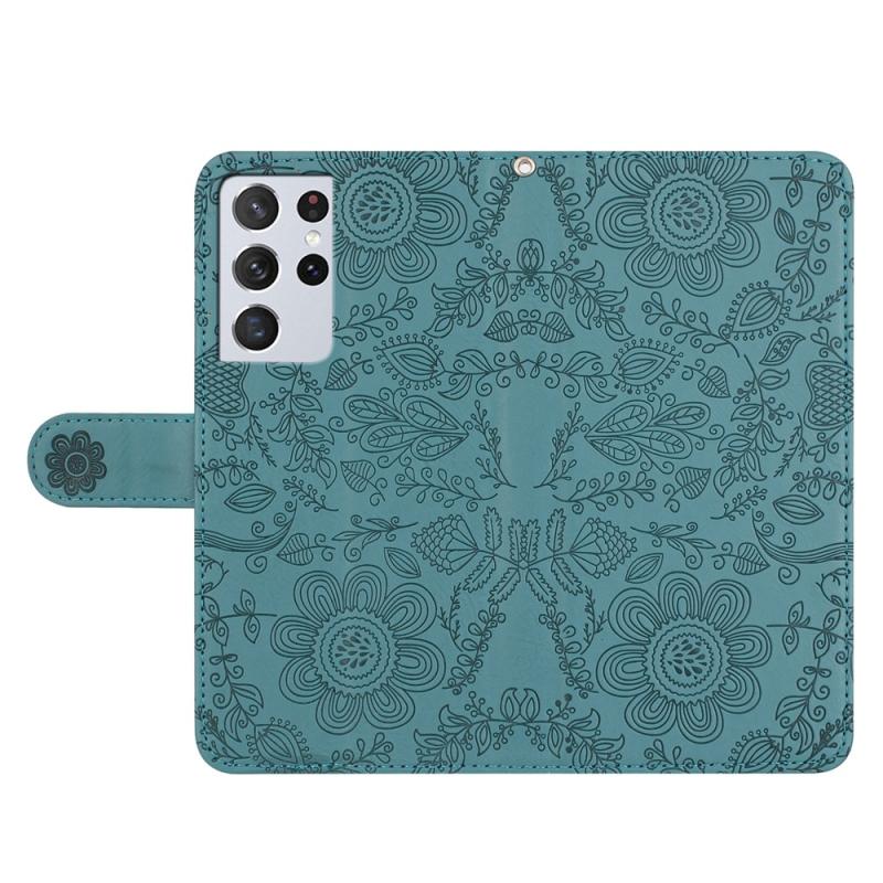 For Samsung Galaxy S21 Ultra 5G Floral Embossed Pattern Leather Phone Case(Dark Green)