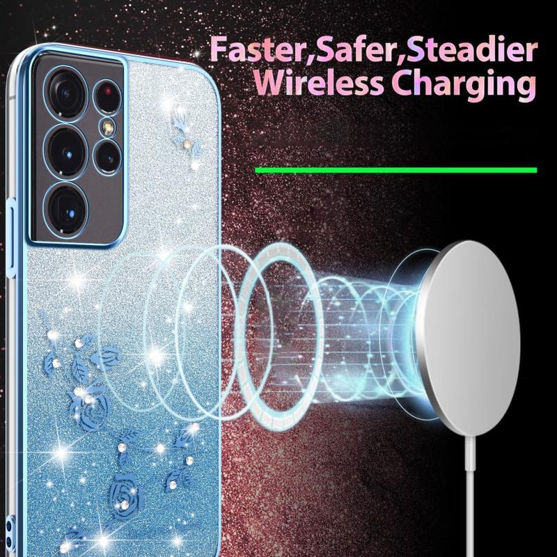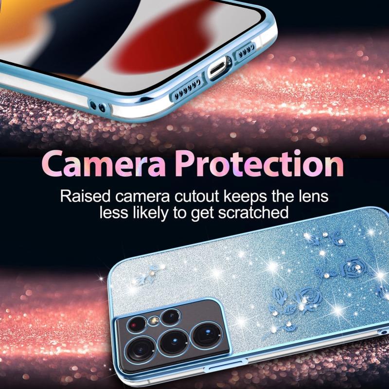 For Samsung Galaxy S21 Ultra 5G Gradient Glitter Flower All-inclusive Phone Case(Blue)