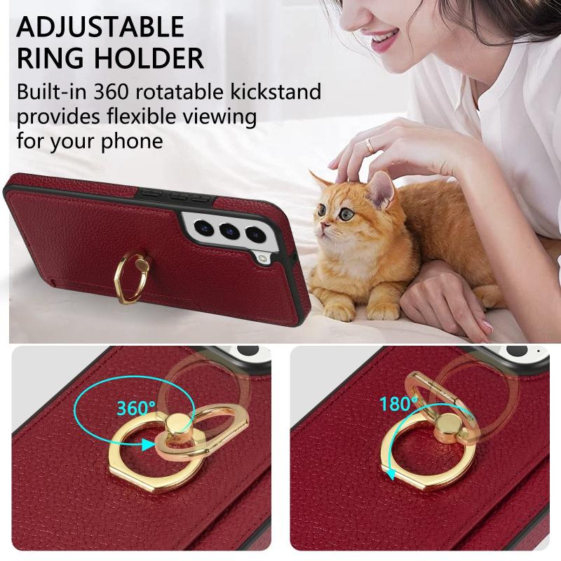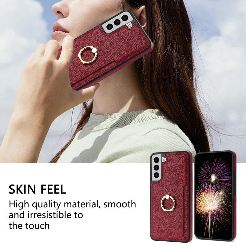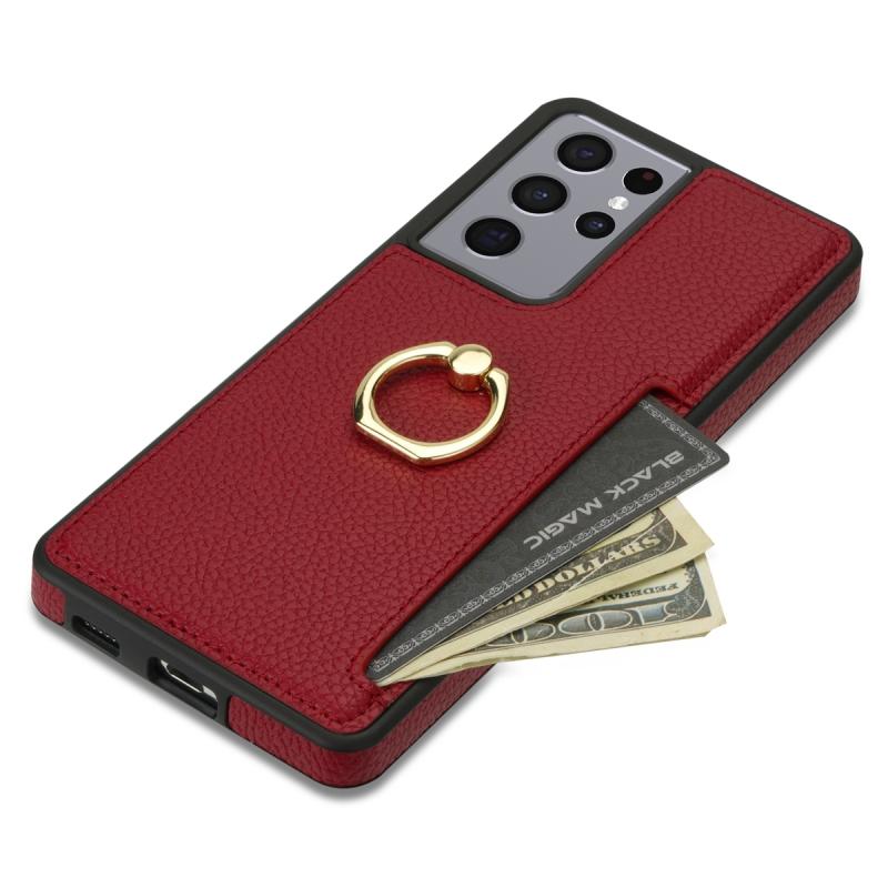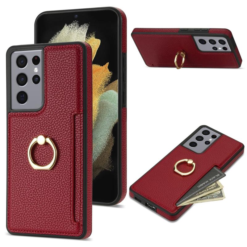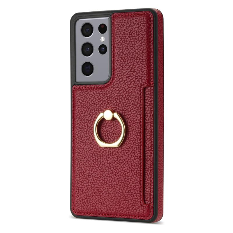 For Samsung Galaxy S21 Ultra 5G Ring Card Litchi Leather Back Phone Case(Red)