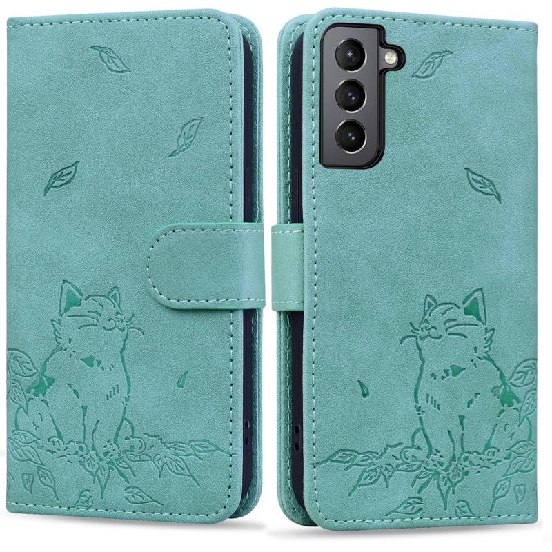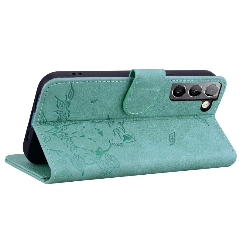 For Samsung Galaxy S22+ 5G Cute Cat Embossed Leather Phone Case(Green)