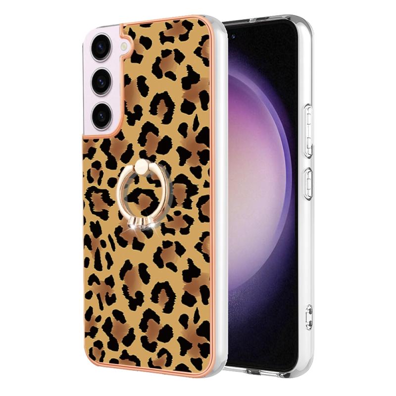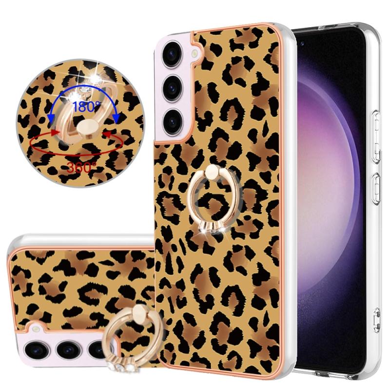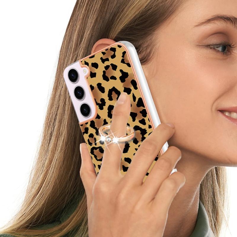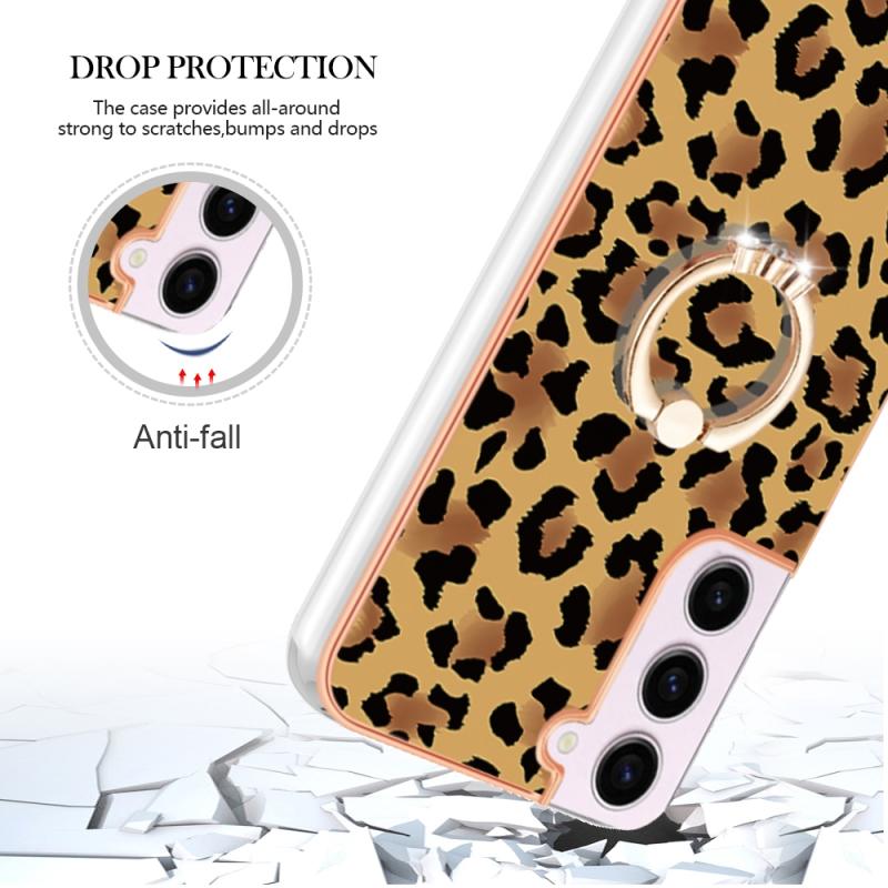 For Samsung Galaxy S22 5G Electroplating Dual-side IMD Phone Case with Ring Holder(Leopard Print)