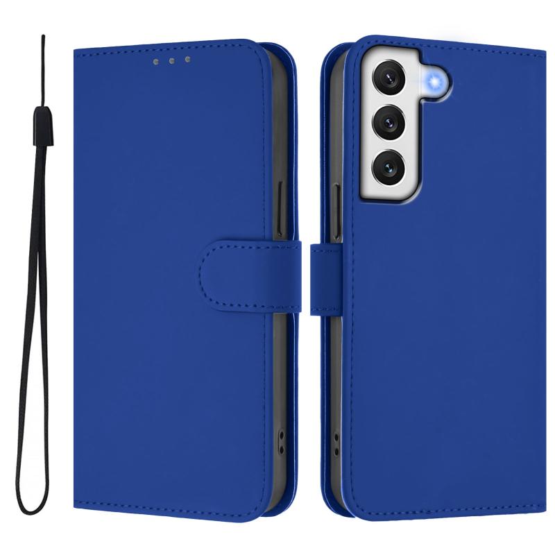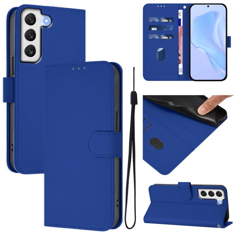 For Samsung Galaxy S22 5G Skin Feel Solid Color Leather Phone Case with Lanyard(Dark Blue)