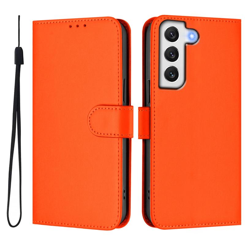 For Samsung Galaxy S22 5G Skin Feel Solid Color Leather Phone Case with Lanyard(Orange)