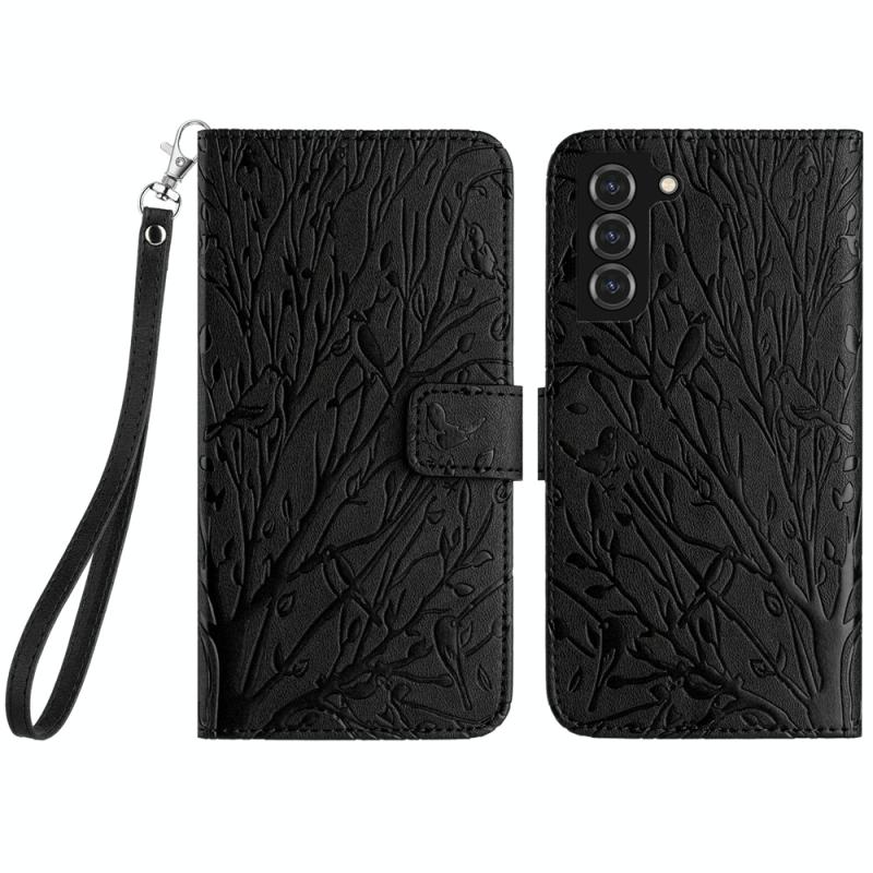 For Samsung Galaxy S22 5G Tree Birds Embossed Pattern Leather Phone Case(Black)