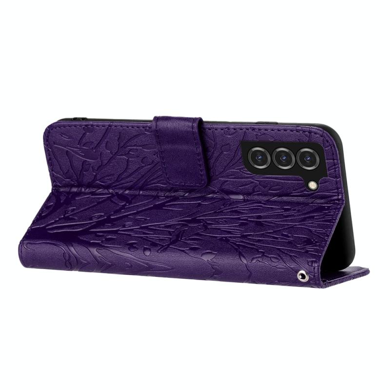 For Samsung Galaxy S22 5G Tree Birds Embossed Pattern Leather Phone Case(Purple)