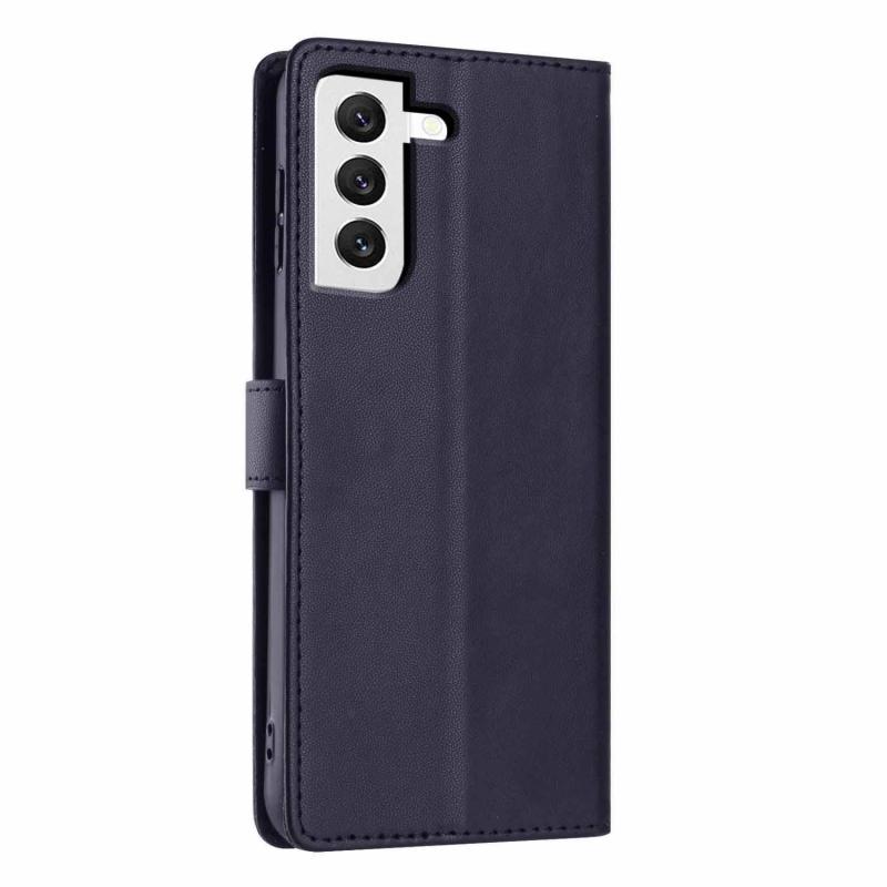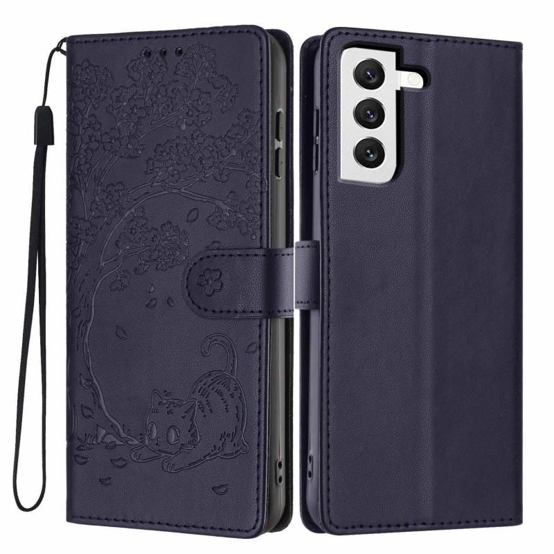 For Samsung Galaxy S22+ 5G Tree Cat Embossed Flip Vegan Leather Phone Case(Dark Blue)