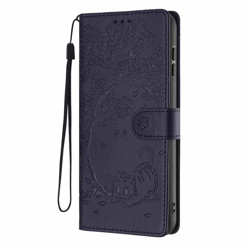 For Samsung Galaxy S22 5G Tree Cat Embossed Flip Vegan Leather Phone Case(Dark Blue)