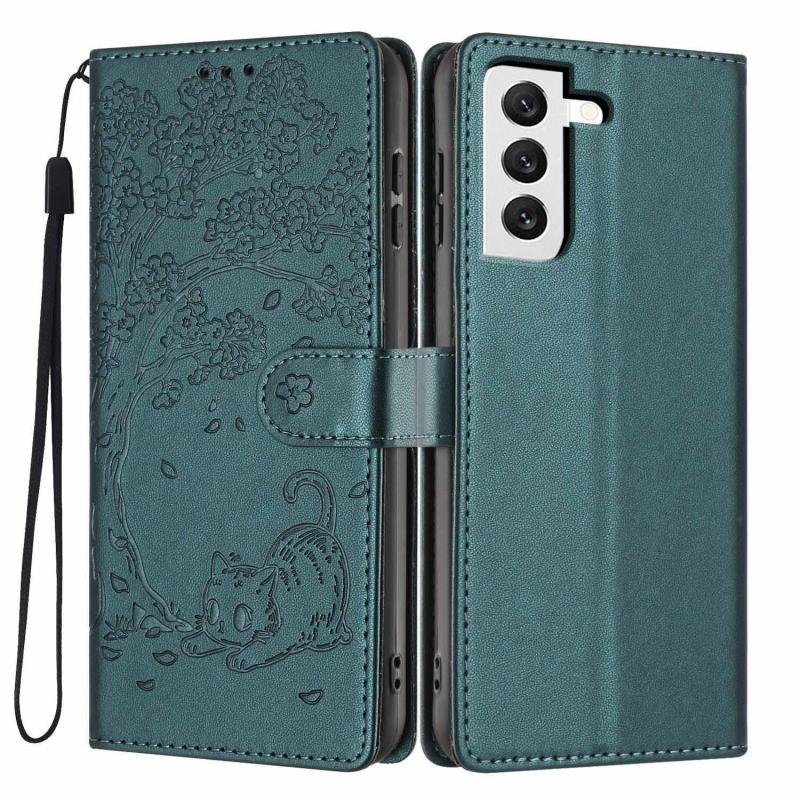 For Samsung Galaxy S22 5G Tree Cat Embossed Flip Vegan Leather Phone Case(Deep Green)